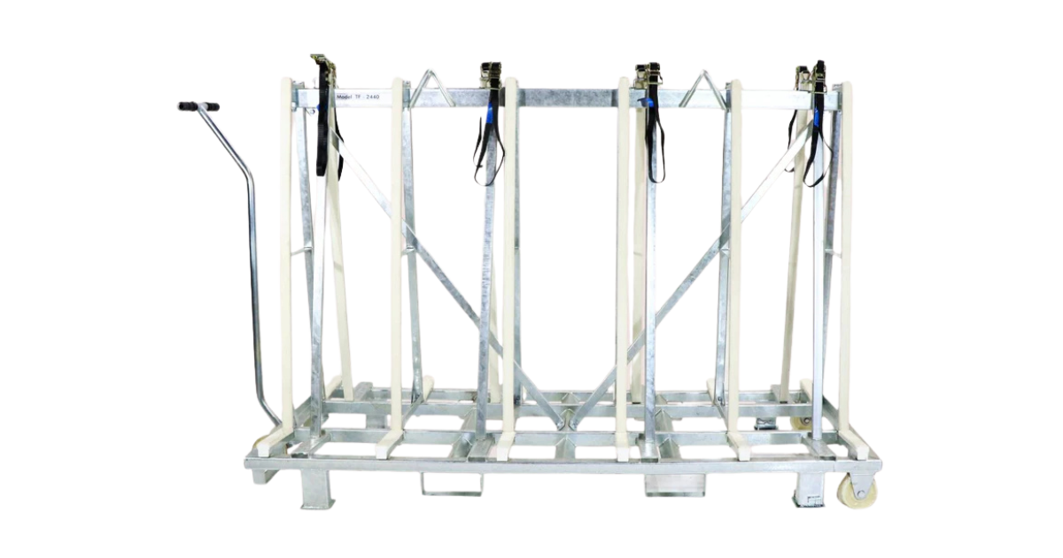 The Aardwolf Transport Frame TF2440 is designed for storing and transporting kitchen tops and other sheet material such as granite, marble, engineered stone, glass and natural stone countertop. The frames are powder-coated or galvanized finish to provide a long-lasting structure. They are equipped with 8 locking bars together with ratchet straps to securely hold loads with transporting loads. Aardwolf Transport Frames are the most versatile frames on the market.