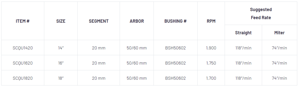 - Miter cuts maximum feed rate of 74"/min on quartzite